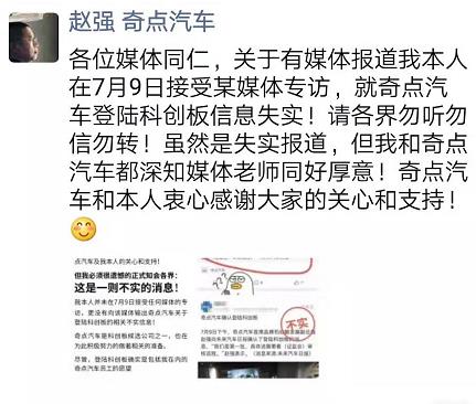 新浪财经讯7月10日,有媒体曝出国内新造车势力奇点汽车将首批登陆科创板,对此奇点汽车首席品牌和战略发展副总裁赵强表示,“关于媒体报道我本人在7月9日接受某媒体专访,就奇点汽车登陆科创板信息失实,请各界勿听勿信勿转。”